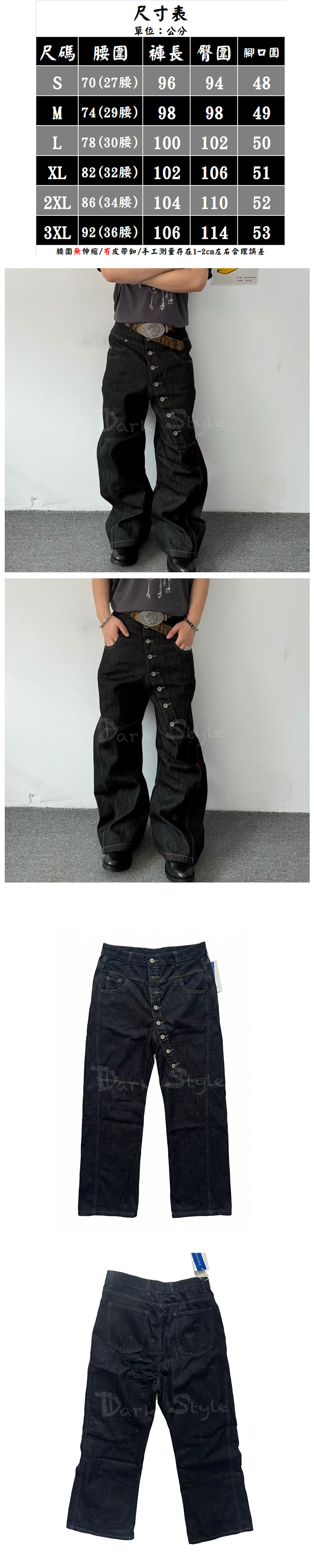 黑布笠衫 (LP2509DK) 「彎」系列丹寧新作。特色在於前檔誇張的長排釦設計,營造強烈的金屬工業感視覺。寬鬆直筒的垮褲版型,不僅修飾腿型,更展現隨性不羈的暗黑街頭風格。