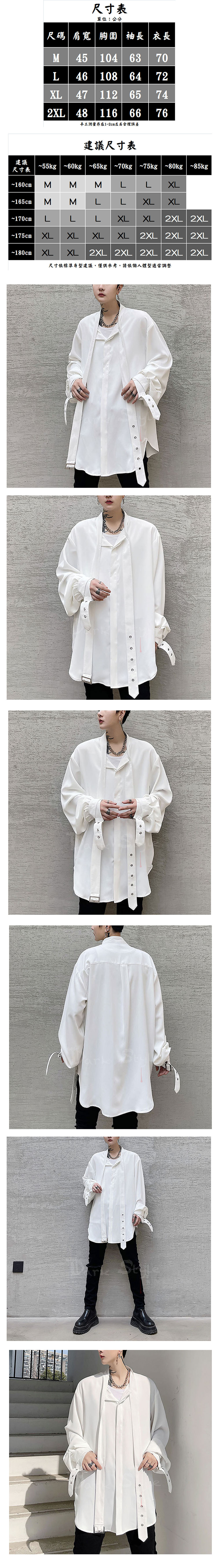 [純粹反差] 少數的純白單品,以長版設計和長帶領細節呈現。作為暗黑系內搭的反差色,增添概念性與視覺衝擊。