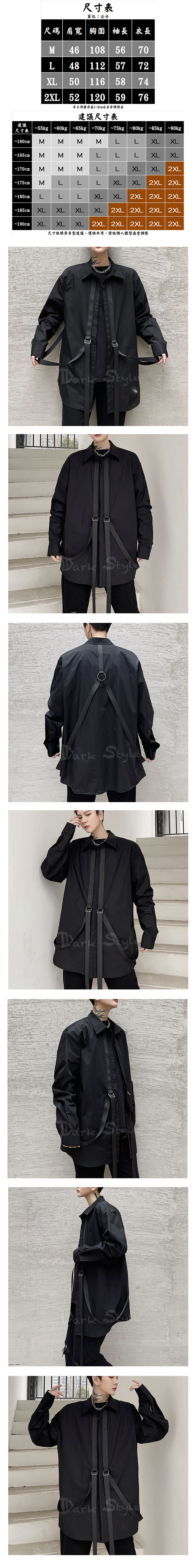 [重工織帶] 襯衫中融入大量的織帶細節,強化視覺上的重工感和機能感。俐落剪裁,是硬派暗黑風格的入門單品。
