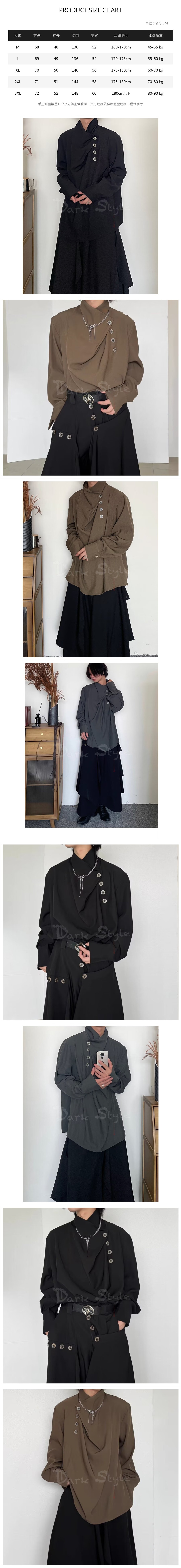 解構不規則立領:打破常規對稱,立領處採用斜向不對稱設計,營造出深邃的視覺層次與神祕感。