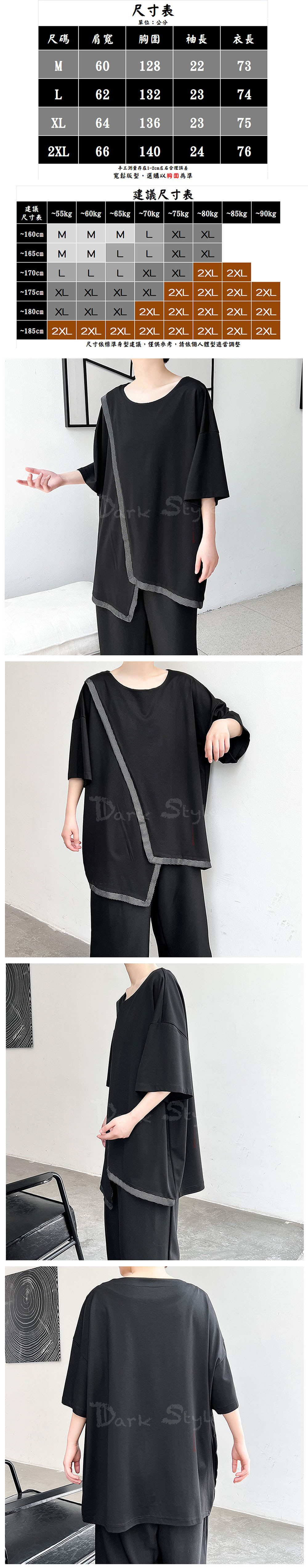 [Sharp Piping] Simple black short sleeve with an irregular hem and silver piping details, creating a sharp, edgy line. Suitable as a light outer layer or worn alone.